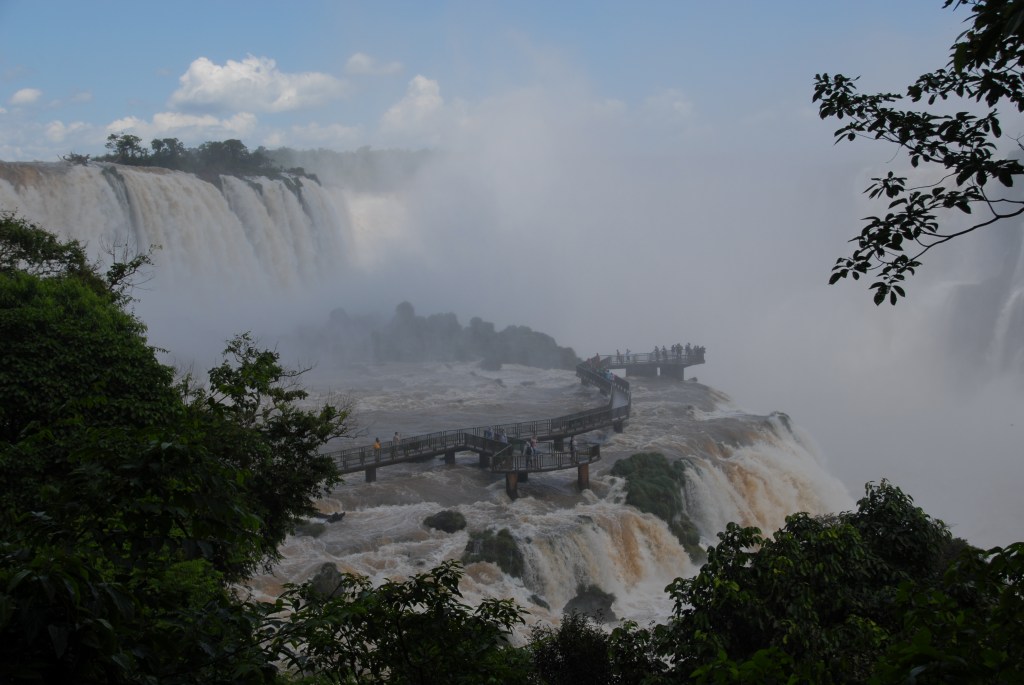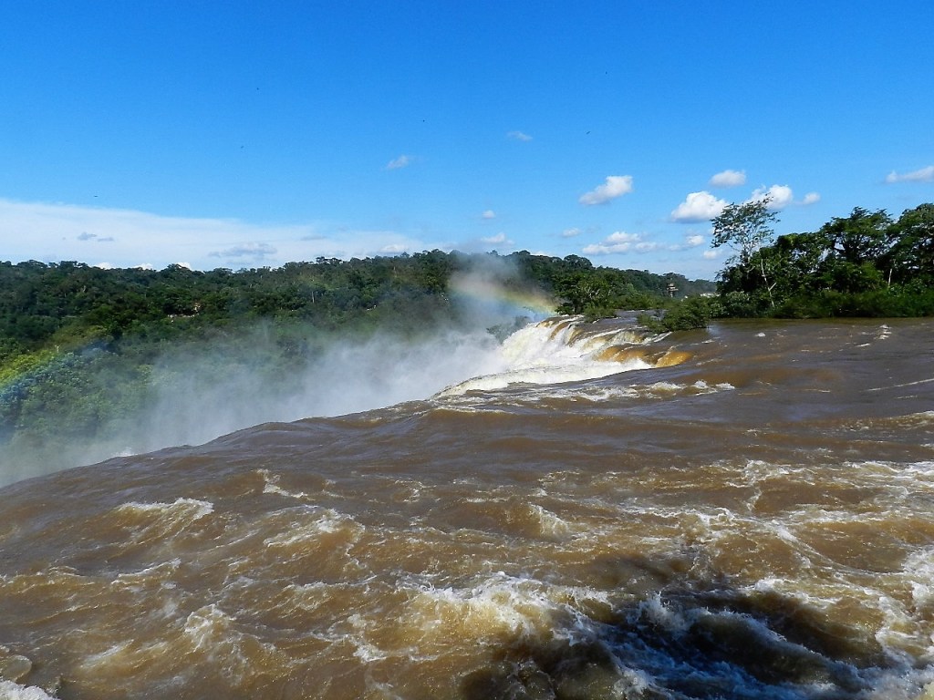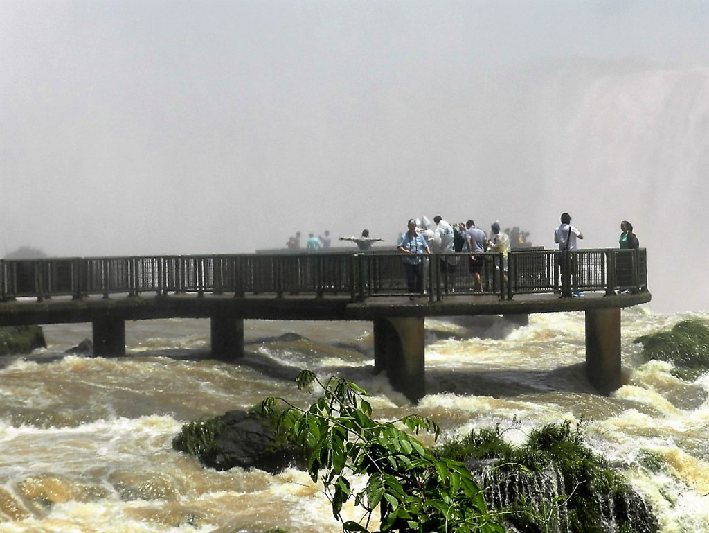 Um die Distanzen im Park einfacher zu überbrücken fährt ein kleiner Zug in regelmäßigen Abständen zwischen drei Bahnhöfen im Park hin und her. Unzählige Wasserfälle können aus der Nähe besichtigt werden. Dazu gibt es mehrere Wanderwege, die in unterschiedliche Teile des Nationalparks führen. Von dort gehen wir einen guten Kilometer zu Fuß über mehrere Brücken. Unglaublich, wie breit der Fluss hier ist! Das Tosen, Donnern und Rauschen werden immer stärker und stärker. Schließlich kommen wir auf einer kleinen Plattform an, von der sich uns ein spektakulärer Ausblick bietet. Wir stehen direkt vor dem Teufelsschlund (Garganta del Diablo). Mit unglaublicher Wucht donnert das Wasser hier in einem hufeisenförmigen Wasserfall in eine Schlucht.