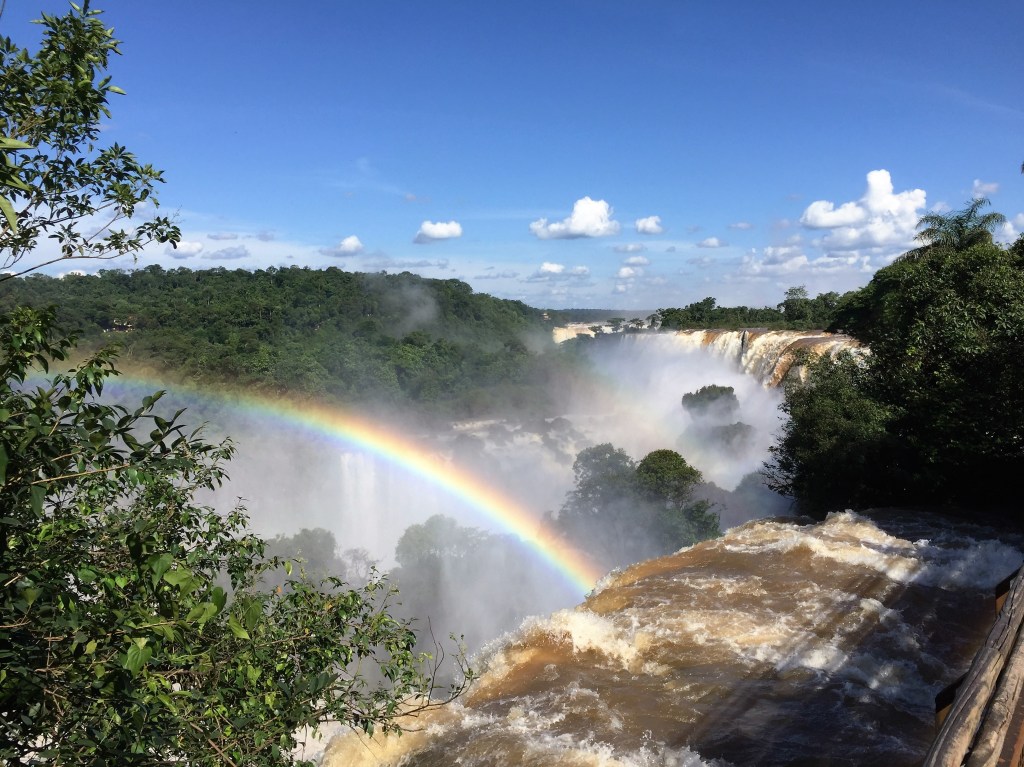 Nach fünf Tagen ging es auf den letzten Teil der Reise. Der Flug zurück nach Buenos Aires war ruhig und wunderschön. Nur ein kurzer Aufenthalt und dann ging es weiter nach Foz do Iguazu in Brasilien. Der Fluss Iguazu bildet die Grenze zwischen Brasilien und Argentinien. Iguazú bedeutet „Großes Wasser“ auf Guaraní und das ist sehr zutreffend. Zumindest hier, im Dreiländereck Brasilien-Argentinien-Paraguay, wo der Fluss kurz vor seiner Mündung in den Paraná ein wahres Spektakel bietet: die Iguazu-Wasserfälle. Die Fälle können von Brasilien und Argentinien aus besucht werden. Zuerst besuchten wir die argentinische Seite. Über die Grenze zurück nach Argentinien dauerte es lange, wir wurden genaustens kontrolliert, konnten aber im Bus sitzen bleiben.