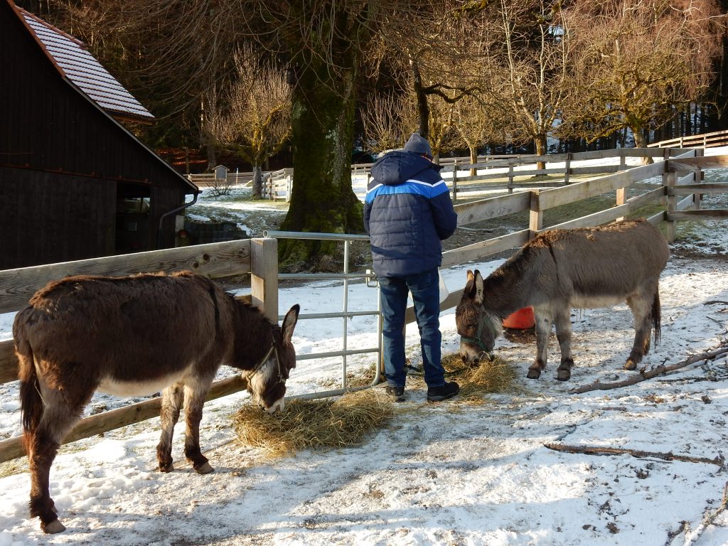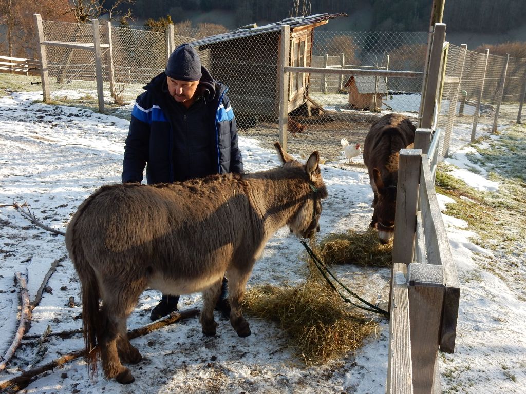 Peter konnte am Anfang noch ein wenig mitanpacken und half so gut er konnte. Zum Beispiel mistete er mit Paul den Eselstall aus. Oder er schichtete Holz für den Winter vor dem Haus auf, sammelte die Eier im Hühnerstall ein, oder half Käthi im grossen Garten. Manchmal sass er auch «nur» auf dem Bänkli vor dem Haus an der Sonne. Es waren absolut stressfreie Tage, Peter konnte helfen oder nicht, ganz wie er es wünschte.