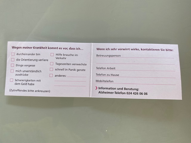Etwas einfacheres, aber wichtiges und praktisches haben wir Peter auch immer in die Tasche gesteckt. Nämlich eine Karte mit all seinen Angaben. Ich fühlte mich so sicherer, unsere Telefonnummer und unsere Adresse waren natürlich auch aufgeschrieben, so konnte eigentlich nichts schief gehen.