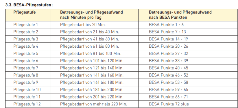 Mit BESA Leistungen steht den Alters- und Pflegeinstitutionen ein von den Krankenversicherern anerkanntes und bewährtes Instrument für die Leistungserfassung und -verrechnung zur Verfügung. Peter wurde nach und nach jeweils höher eingestuft und momentan ist er in der Pflegestufe 10 von 12.