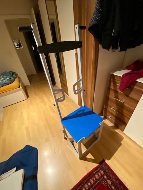 Nun musste ich Schritt für Schritt vorgehen. Zuerst beruhigte ich Peter und schob ihm ein Kissen unter den Kopf. Dann klappte ich den Hebix auseinander, platzierte seine Beine über den Sitz, was gar nicht leicht war. Als dies gelang, schob ich die Griffe in die vorgesehenen Öffnungen und band Peter mit dem Gurt fest. Nun musste ich ihn nur noch langsam hochheben, schauen, dass die Beine des Stuhls sich öffneten, und dann sass Peter aufrecht und stabil auf dem Hebix. Geschafft! Es brauchte sehr viel Kraft und es war anstrengend. Sass er mal, war es aber überhaupt kein Problem mehr, Peter konnte aufstehen und ich konnte ihn zum nächsten Stuhl führen.
