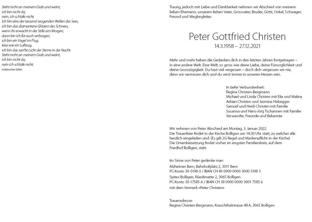 4. Liebi Regina. Myni herzlichi Ateilnahm zum schmezliche Verluscht vom Peter. Y fühle mit Dyr und Dyne Familene mit grosser Dankbarkeit. Danke viu mau, Regina, dass y 3 Tag vorher mit Dyr und de Familie vom Micha na ha dörfe vom Peter Abschied näh. So, wiä uf de obige Foto, wyrde y de Peter in Erinnerig b’halte.